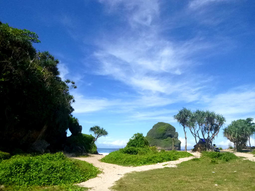 Pemandangan beberapa pulau karang bisa anda nikmati di pantai yang sangat indah ini. Hijaunya pulau karang seakan menambah keindahan laut yang begitu elok untuk dapat dilihat sepanjang mata anda memandang. Jika anda tidak mau kehilangan momen – momen yang bagus di pantai ini anda wajib membawa kamera DSLR atau kamera digital karena di Pantai Goa Cina ini terdapat banyak spot – spot yang menjaubkan dan cantik yang dapat anda temukan.